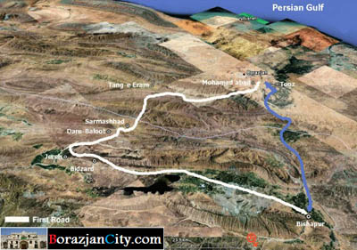 شواهد باستانشناسی در دشت های کازرون و برازجان و آزمایش موانع طبیعی و گذرگاه ها اینطور می نماید که آنجا دو مسیر قدیمی از بیشاپور تا برازجان وجود داشته است. اولین آن از بیشاپور شروع، سپس به جره، سر مشهد، بزپر، تنگ ارم، دالکی و بعد برازجان ادامه می یافته است. و دومین مسیر بیشاپور تا برازجان، از میان دورترین نقاطه غرب دشت کازرون، سپس تا تنگ ترکان، کنارتخته، خشت، و پل مشیر ادامه می یافته است.
